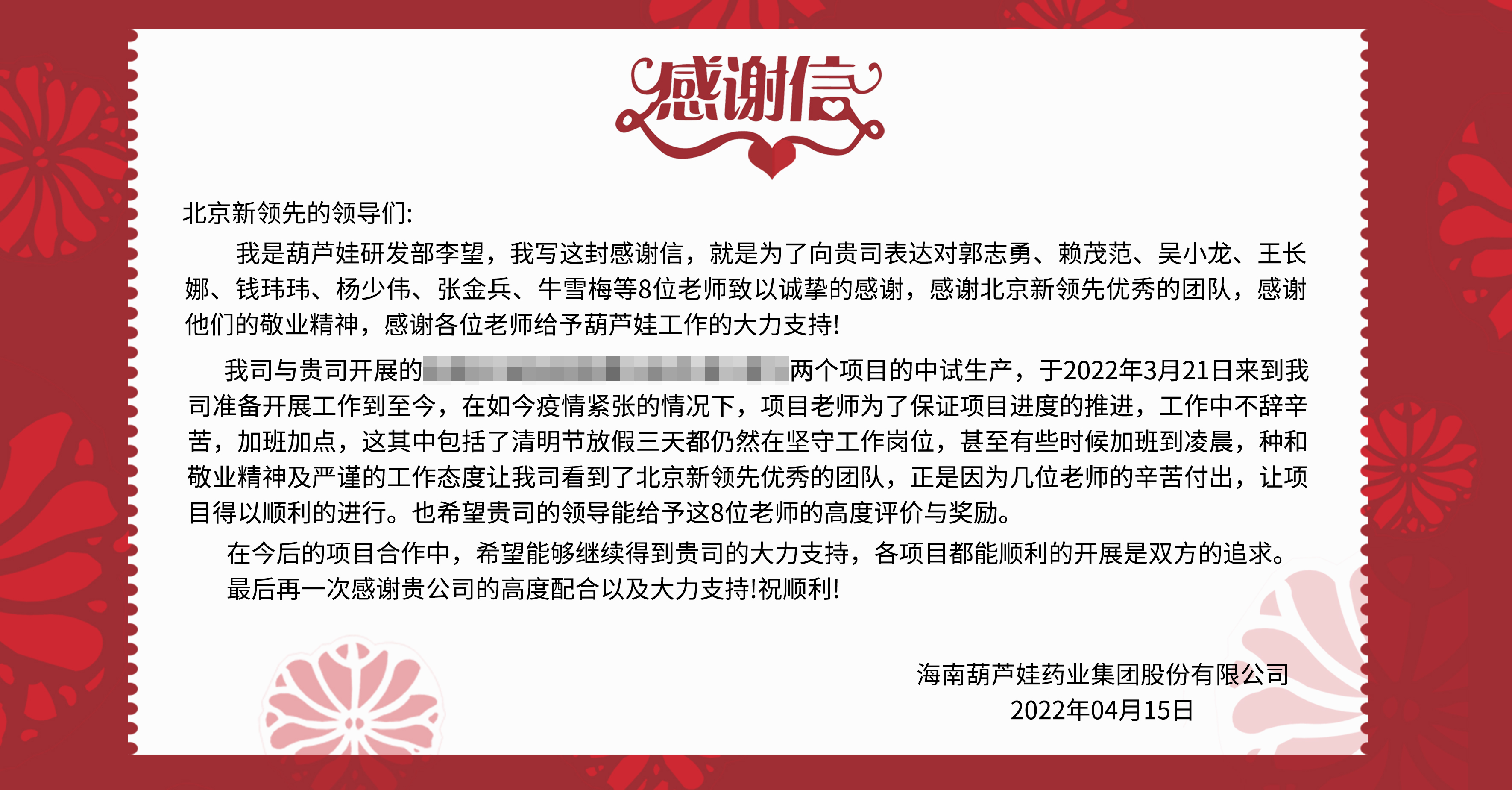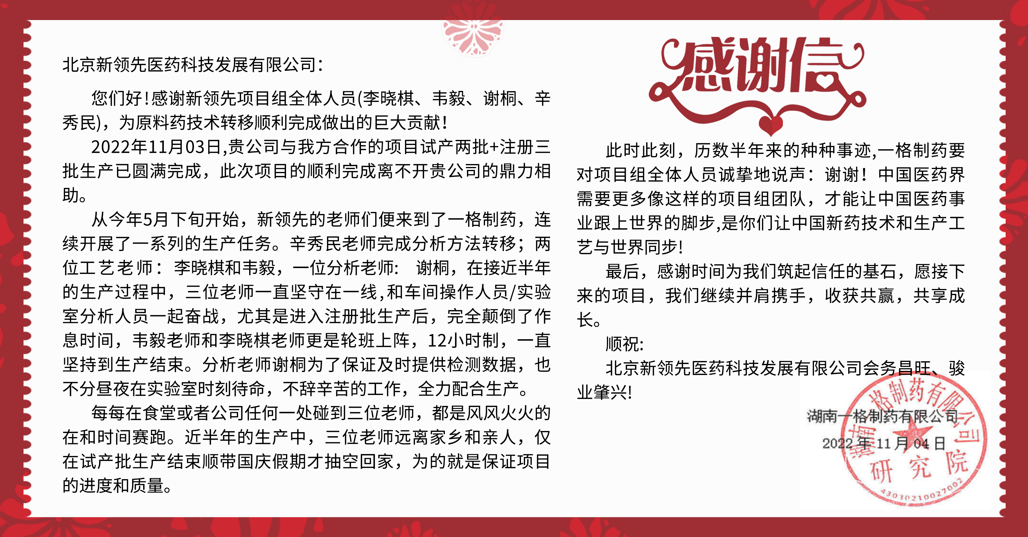 一封封來自客戶的表揚信,讓我們更加堅信“每一份努力都會被看到”,青春是用來奮斗的,每位新領(lǐng)先人始終懷揣“是我,讓中國新藥技術(shù)和生產(chǎn)工藝與世界同步”的企業(yè)愿景,在中國大地上探尋青春的價值和人生的答案!