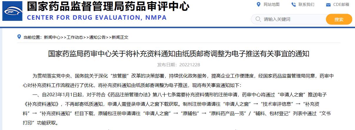 國家藥監(jiān)局藥審中心關(guān)于將補充資料通知由紙質(zhì)郵寄調(diào)整為電子推送有關(guān)事宜的通知