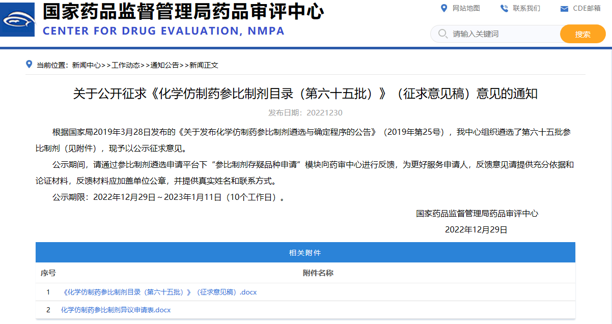 關(guān)于公開征求《化學(xué)仿制藥參比制劑目錄(第六十五批)》(征求意見稿)意見的通知