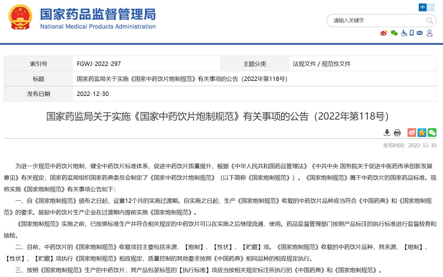 國家藥監(jiān)局關(guān)于實(shí)施《國家中藥飲片炮制規(guī)范》有關(guān)事項(xiàng)的公告(2022年第118號)