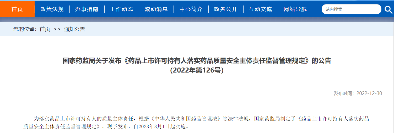 國家藥監(jiān)局關(guān)于發(fā)布《藥品上市許可持有人落實(shí)藥品質(zhì)量安全主體責(zé)任監(jiān)督管理規(guī)定》的公告(2022年第126號)