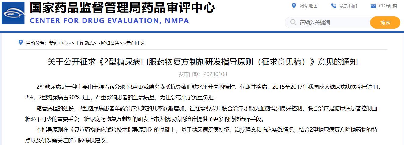 關(guān)于公開征求《2型糖尿病口服藥物復(fù)方制劑研發(fā)指導(dǎo)原則(征求意見稿)》意見的通知