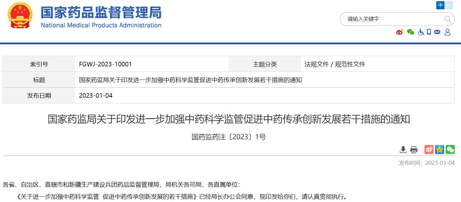 國家藥監(jiān)局關(guān)于印發(fā)進(jìn)一步加強(qiáng)中藥科學(xué)監(jiān)管促進(jìn)中藥傳承創(chuàng)新發(fā)展若干措施的通知