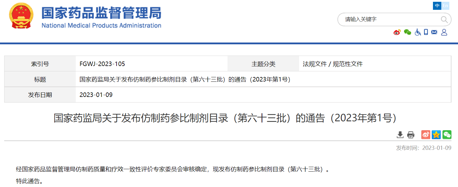 國家藥監(jiān)局關于發(fā)布仿制藥參比制劑目錄(第六十三批)的通告(2023年第1號)
