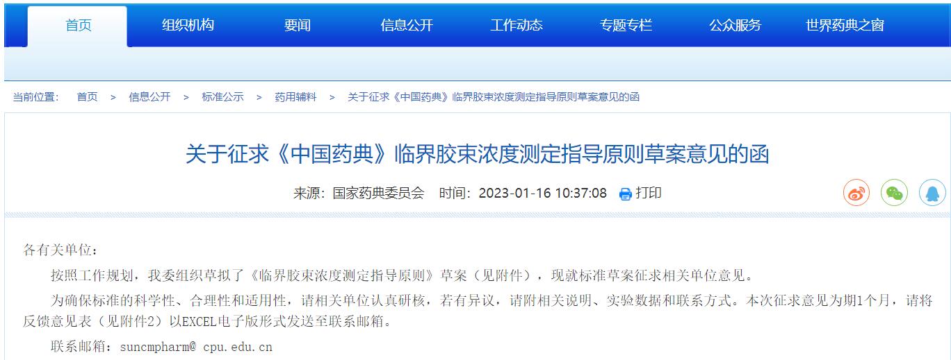 關于征求《中國藥典》臨界膠束濃度測定指導原則草案意見的函