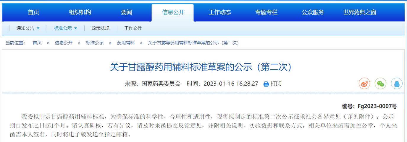 關于甘露醇藥用輔料標準草案的公示(第二次)