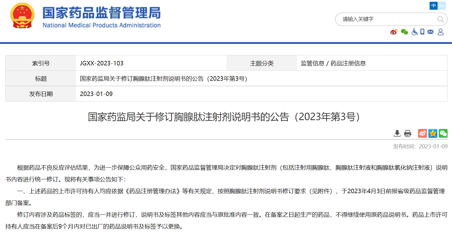 國家藥監(jiān)局關于修訂胸腺肽注射劑說明書的公告(2023年第3號)