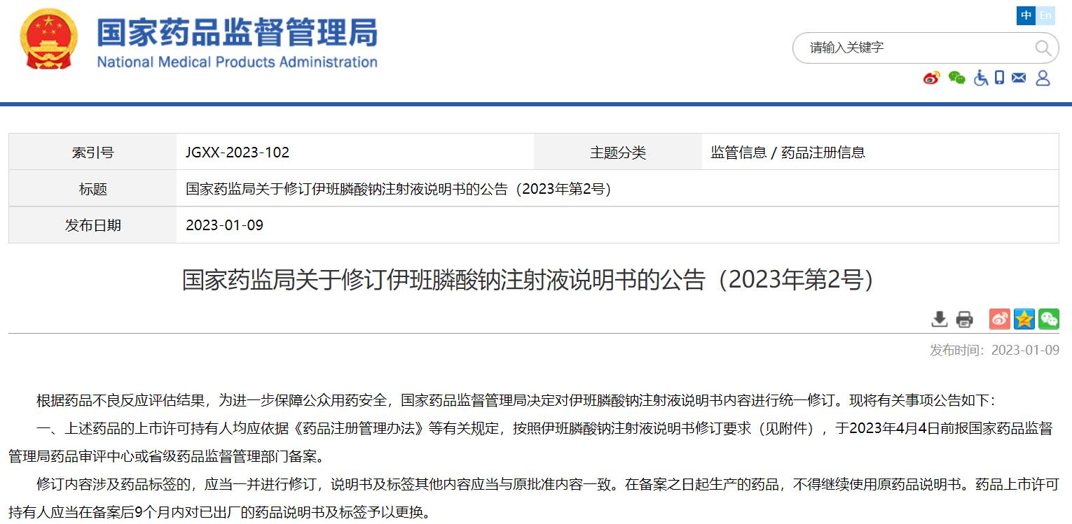國家藥監(jiān)局關于修訂伊班膦酸鈉注射液說明書的公告(2023年第2號)