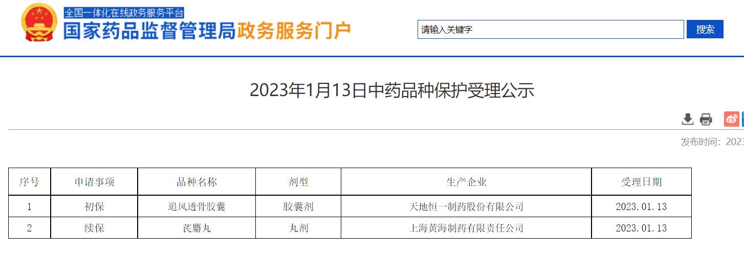 2023年1月13日中藥品種保護受理公示
