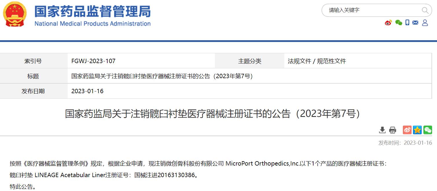 國家藥監(jiān)局關于注銷髖臼襯墊醫(yī)療器械注冊證書的公告(2023年第7號)