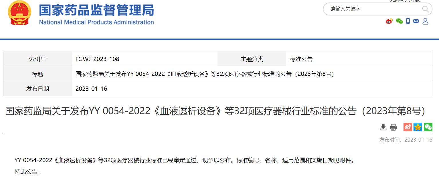 國家藥監(jiān)局關于發(fā)布YY 0054-2022《血液透析設備》等32項醫(yī)療器械行業(yè)標準的公告(2023年第8號)