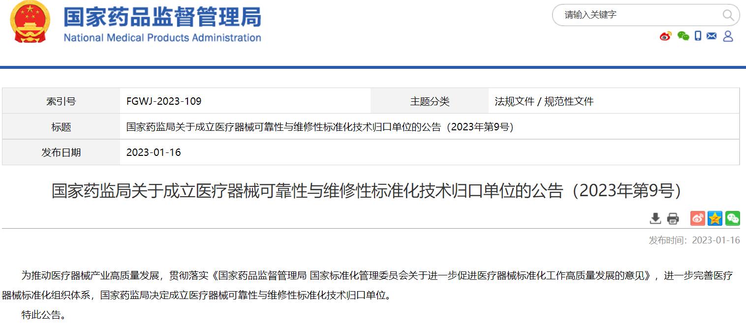 國家藥監(jiān)局關于成立醫(yī)療器械可靠性與維修性標準化技術歸口單位的公告(2023年第9號)
