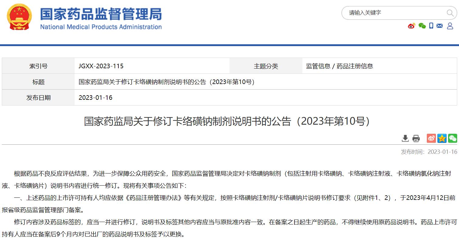 國家藥監(jiān)局關于修訂卡絡磺鈉制劑說明書的公告(2023年第10號)