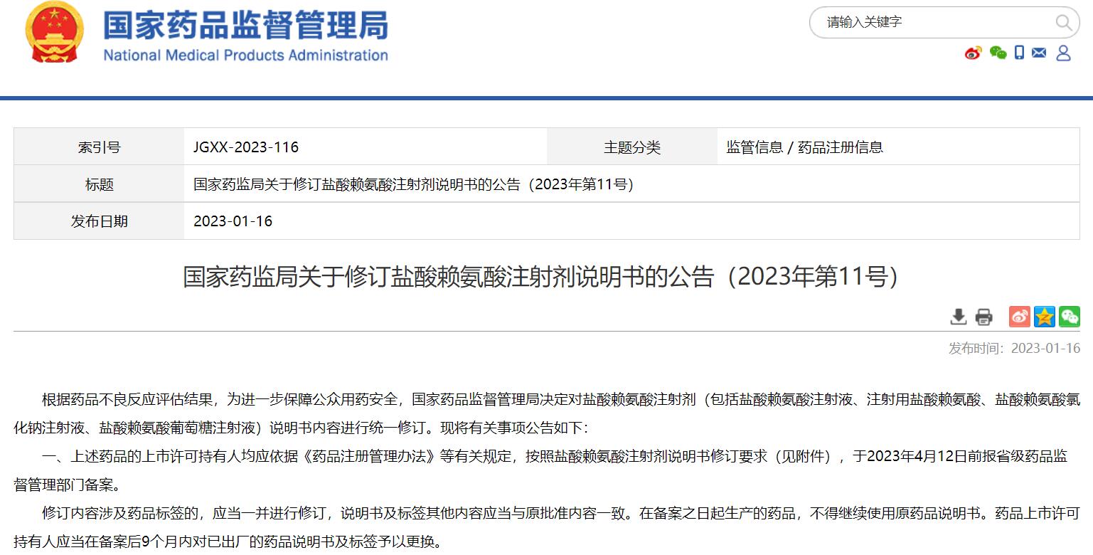 國家藥監(jiān)局關于修訂鹽酸賴氨酸注射劑說明書的公告(2023年第11號)