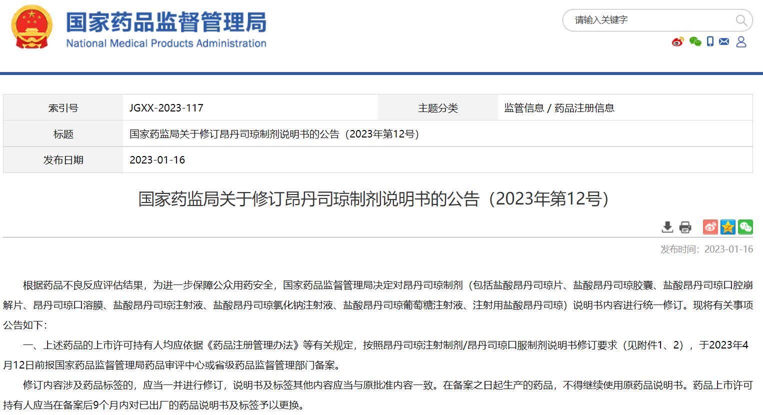 國家藥監(jiān)局關于修訂昂丹司瓊制劑說明書的公告(2023年第12號)