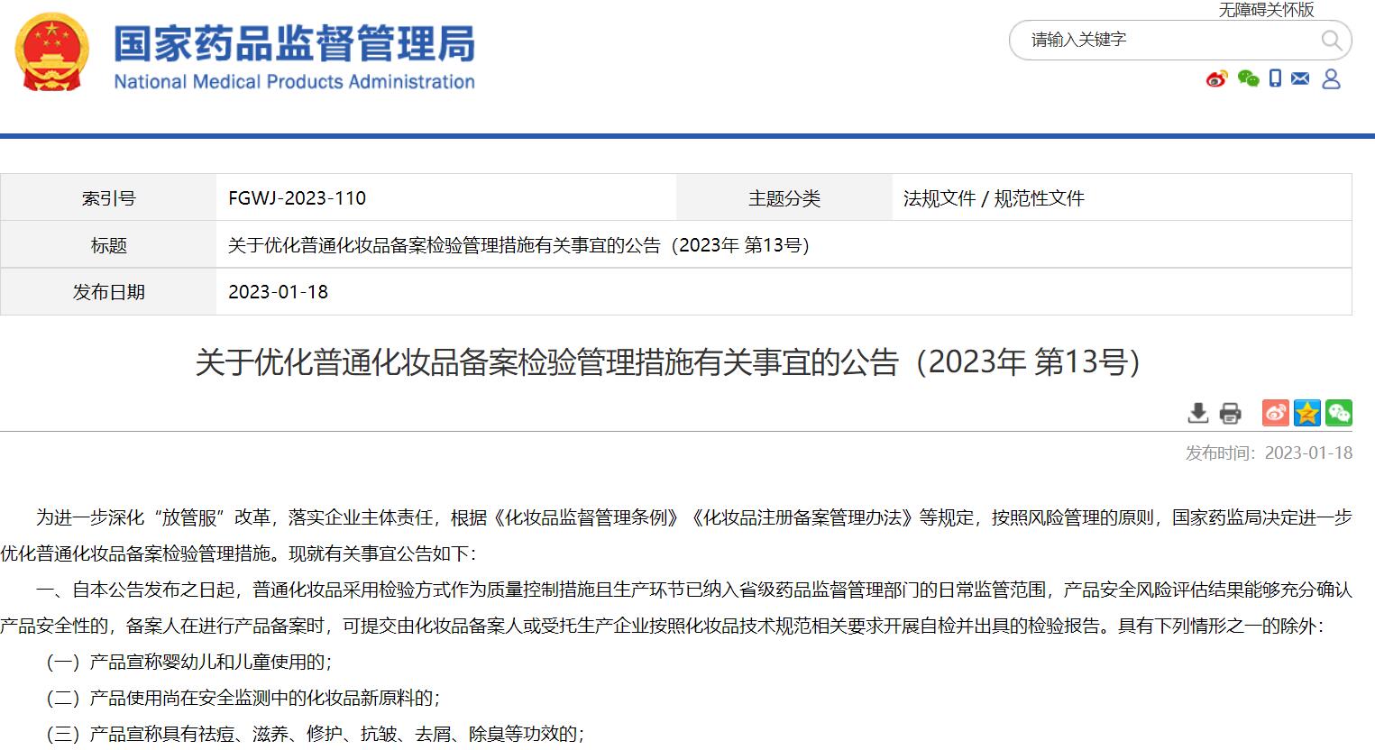關于優(yōu)化普通化妝品備案檢驗管理措施有關事宜的公告(2023年 第13號)