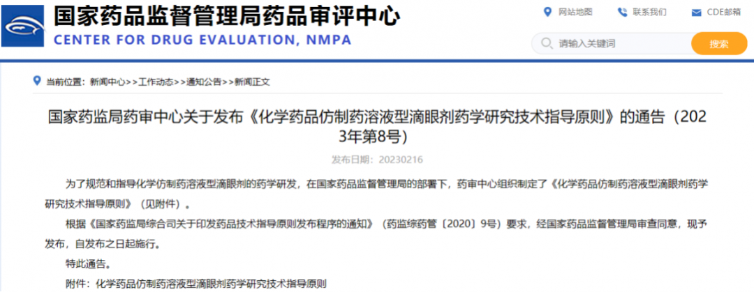 國(guó)家藥監(jiān)局藥審中心關(guān)于發(fā)布《化學(xué)藥品仿制藥溶液型滴眼劑藥學(xué)研究技術(shù)指導(dǎo)原則》的通告(2023年第8號(hào))