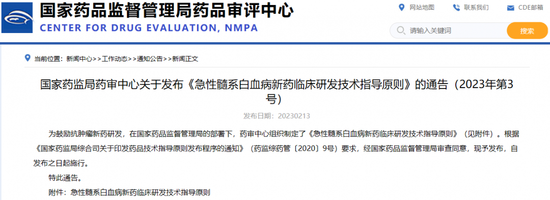 國(guó)家藥監(jiān)局藥審中心關(guān)于發(fā)布《急性髓系白血病新藥臨床研發(fā)技術(shù)指導(dǎo)原則》的通告(2023年第3號(hào))