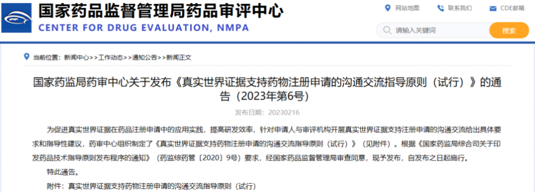 國(guó)家藥監(jiān)局藥審中心關(guān)于發(fā)布《真實(shí)世界證據(jù)支持藥物注冊(cè)申請(qǐng)的溝通交流指導(dǎo)原則(試行)》的通告(2023年第6號(hào))