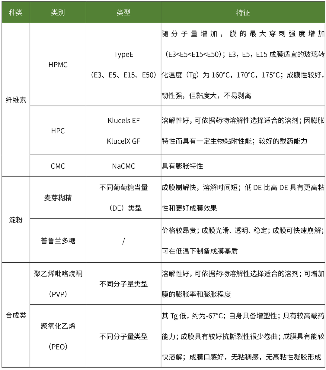 目前在口溶膜處方中廣泛使用的水溶性成膜聚合物包括:纖維素類、淀粉類、半合成、合成的成膜聚合物等,其特性如下表所示: