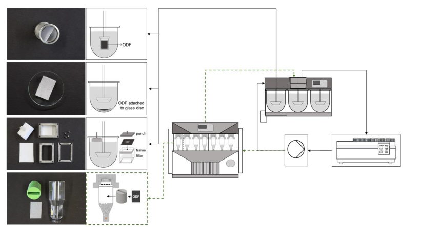 Raphael Kramp等人采用紫外光纖探頭實時檢測溶出數(shù)據(jù),基于槳法溶出方法設計開發(fā)了“Punch & Filter method”,主要設計增加了一個放置口溶膜的裝置,由不銹鋼框架,濾膜,14g壓沖組成,濾膜卡入不銹鋼框架中,口溶膜放置在濾膜上,14g壓沖放置在口溶膜上,溶出介質從底部通過濾膜潤濕口溶膜,使口溶膜在不銹鋼框架內(nèi)溶解,14g壓沖模擬舌機械力。