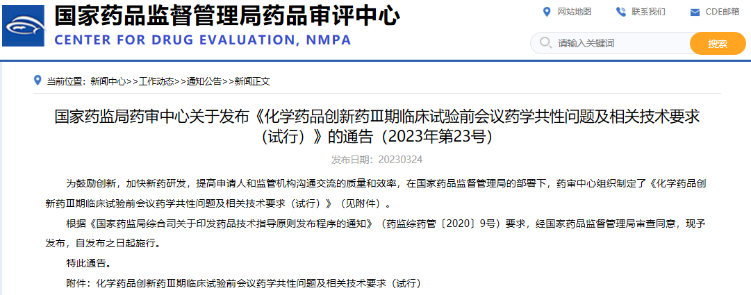 國家藥監(jiān)局藥審中心關(guān)于發(fā)布《化學藥品創(chuàng)新藥Ⅲ期臨床試驗前會議藥學共性問題及相關(guān)技術(shù)要求(試行)》的通告(2023年第23號)