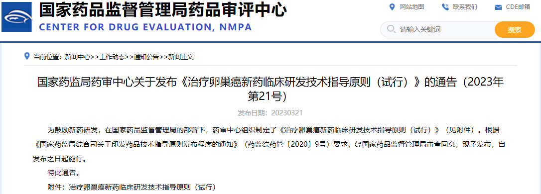 國家藥監(jiān)局藥審中心關(guān)于發(fā)布《治療卵巢癌新藥臨床研發(fā)技術(shù)指導原則(試行)》的通告(2023年第21號)