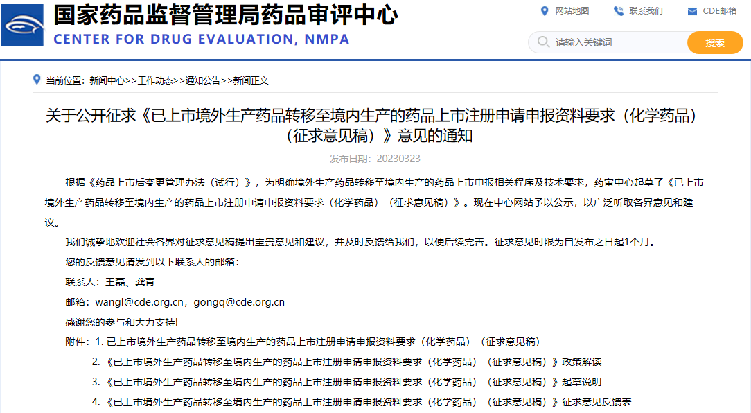 關(guān)于公開征求《已上市境外生產(chǎn)藥品轉(zhuǎn)移至境內(nèi)生產(chǎn)的藥品上市注冊申請申報資料要求(化學藥品)(征求意見稿)》意見的通知
