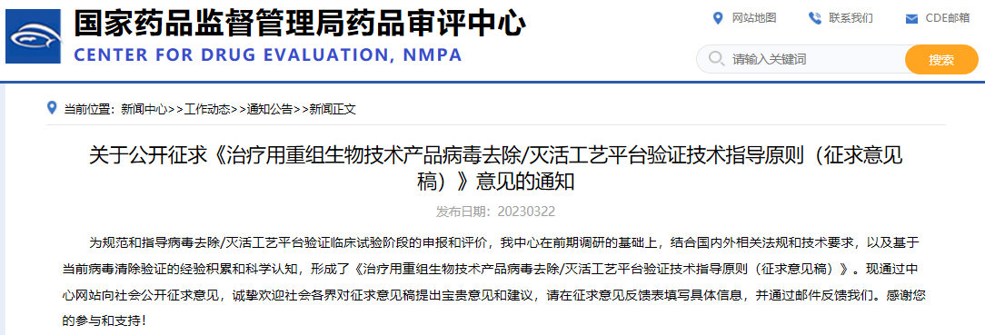 關(guān)于公開征求《治療用重組生物技術(shù)產(chǎn)品病毒去除/滅活工藝平臺驗證技術(shù)指導原則(征求意見稿)》意見的通知