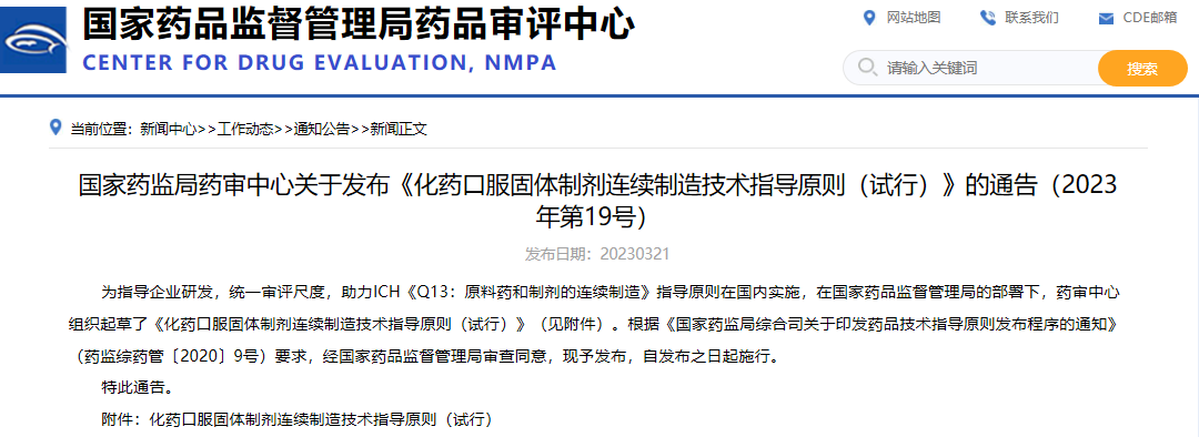 國家藥監(jiān)局藥審中心關(guān)于發(fā)布《化藥口服固體制劑連續(xù)制造技術(shù)指導原則(試行)》的通告(2023年第19號)