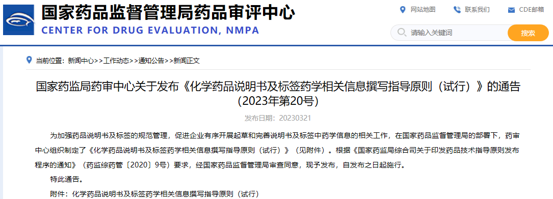 國家藥監(jiān)局藥審中心關(guān)于發(fā)布《化學藥品說明書及標簽藥學相關(guān)信息撰寫指導原則(試行)》的通告(2023年第20號)