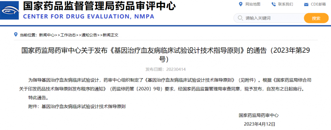 國家藥監(jiān)局藥審中心關(guān)于發(fā)布《基因治療血友病臨床試驗(yàn)設(shè)計(jì)技術(shù)指導(dǎo)原則》的通告(2023年第29號)
