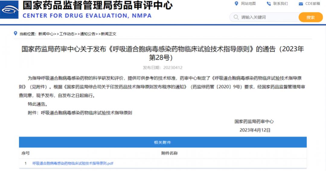 國家藥監(jiān)局藥審中心關(guān)于發(fā)布《呼吸道合胞病毒感染藥物臨床試驗(yàn)技術(shù)指導(dǎo)原則》的通告(2023年第28號)