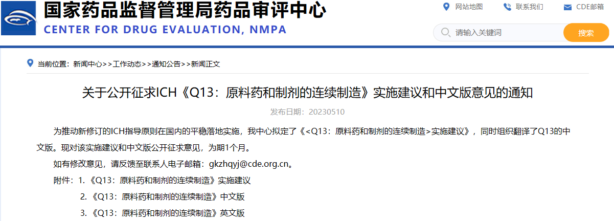關(guān)于公開征求ICH《Q13:原料藥和制劑的連續(xù)制造》實(shí)施建議和中文版意見的通知