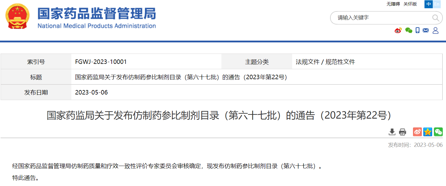 國家藥監(jiān)局關(guān)于發(fā)布仿制藥參比制劑目錄(第六十七批)的通告(2023年第22號)