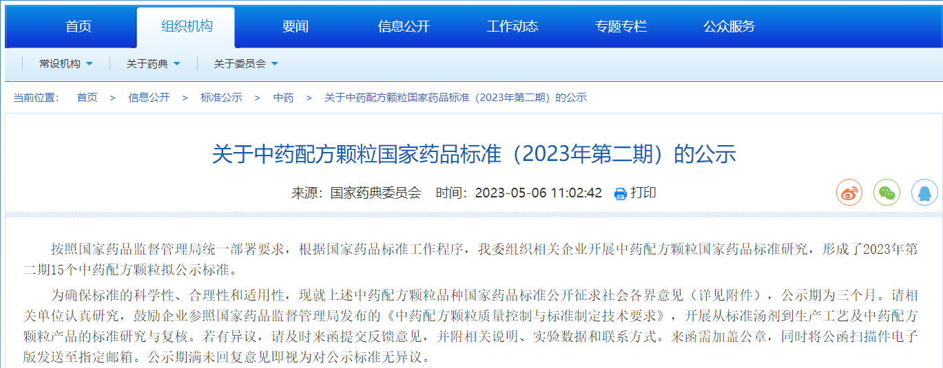 國家藥典委關(guān)于中藥配方顆粒國家藥品標(biāo)準(zhǔn)(2023年第二期)的公示