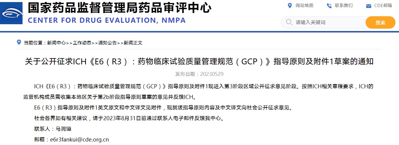 關于公開征求ICH《E6(R3):藥物臨床試驗質量管理規(guī)范(GCP)》指導原則及附件1草案的通知