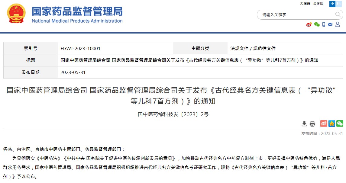 國家中醫(yī)藥管理局綜合司 國家藥品監(jiān)督管理局綜合司關于發(fā)布《古代經典名方關鍵信息表(“異功散”等兒科7首方劑)》的通知