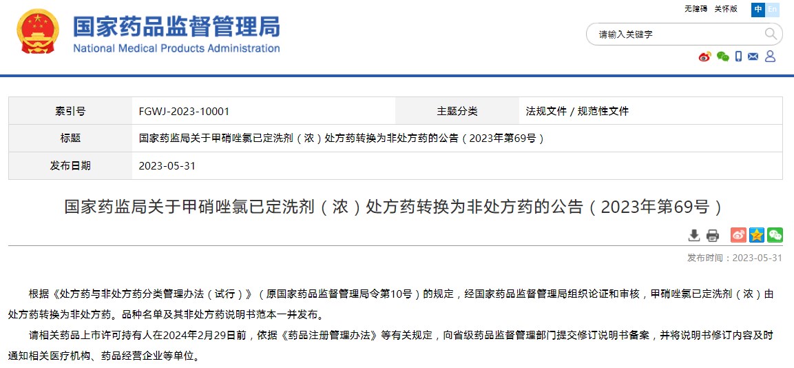 國家藥監(jiān)局關于甲硝唑氯已定洗劑(濃)處方藥轉換為非處方藥的公告(2023年第69號)