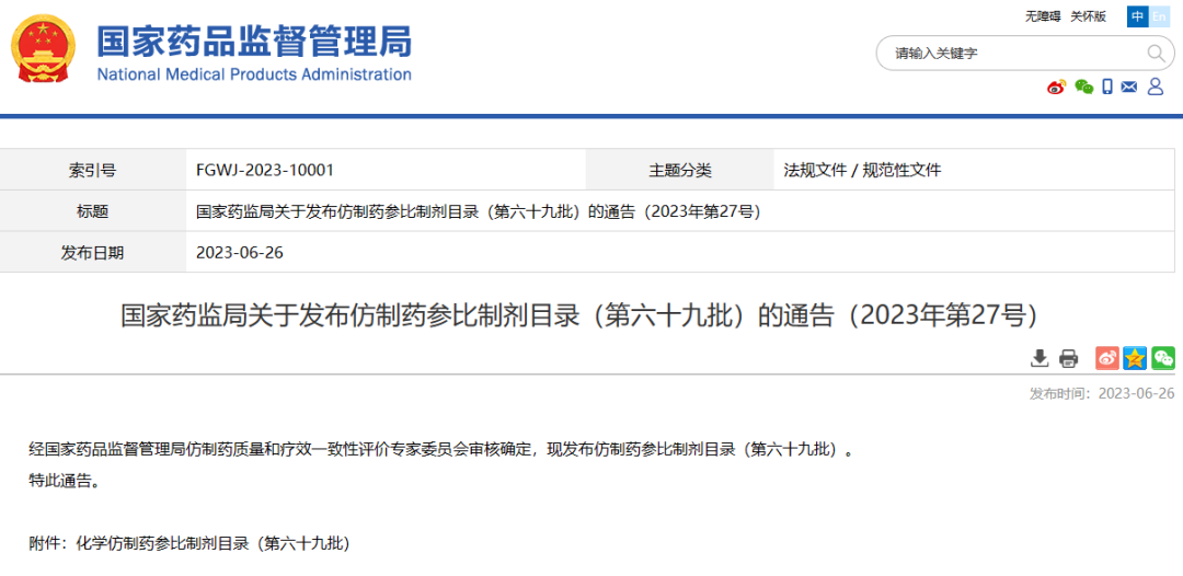 國(guó)家藥監(jiān)局關(guān)于發(fā)布仿制藥參比制劑目錄(第六十九批)的通告(2023年第27號(hào))