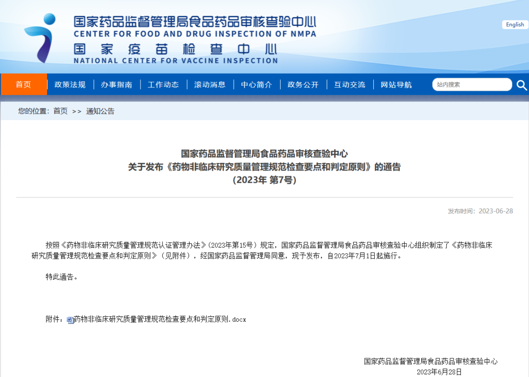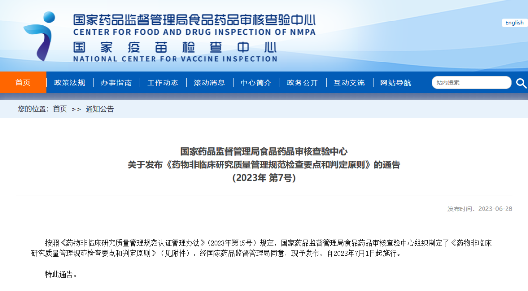 國(guó)家藥品監(jiān)督管理局食品藥品審核查驗(yàn)中心關(guān)于發(fā)布《藥物非臨床研究質(zhì)量管理規(guī)范檢查要點(diǎn)和判定原則》的通告(2023年 第7號(hào))