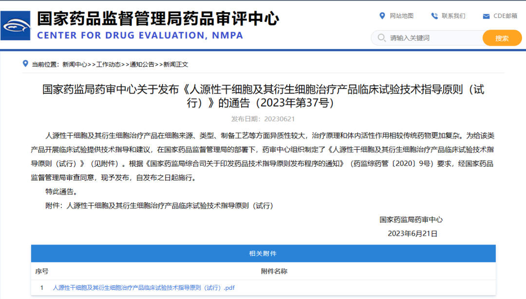 國(guó)家藥監(jiān)局藥審中心關(guān)于發(fā)布《人源性干細(xì)胞及其衍生細(xì)胞治療產(chǎn)品臨床試驗(yàn)技術(shù)指導(dǎo)原則(試行)》的通告(2023年第37號(hào))