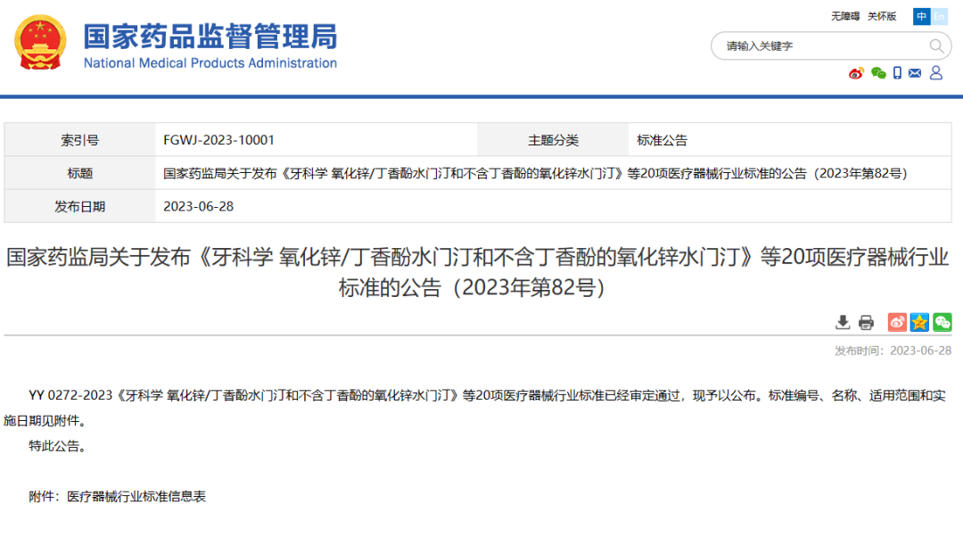 國(guó)家藥監(jiān)局關(guān)于發(fā)布《牙科學(xué) 氧化鋅/丁香酚水門(mén)汀和不含丁香酚的氧化鋅水門(mén)汀》等20項(xiàng)醫(yī)療器械行業(yè)標(biāo)準(zhǔn)的公告(2023年第82號(hào))