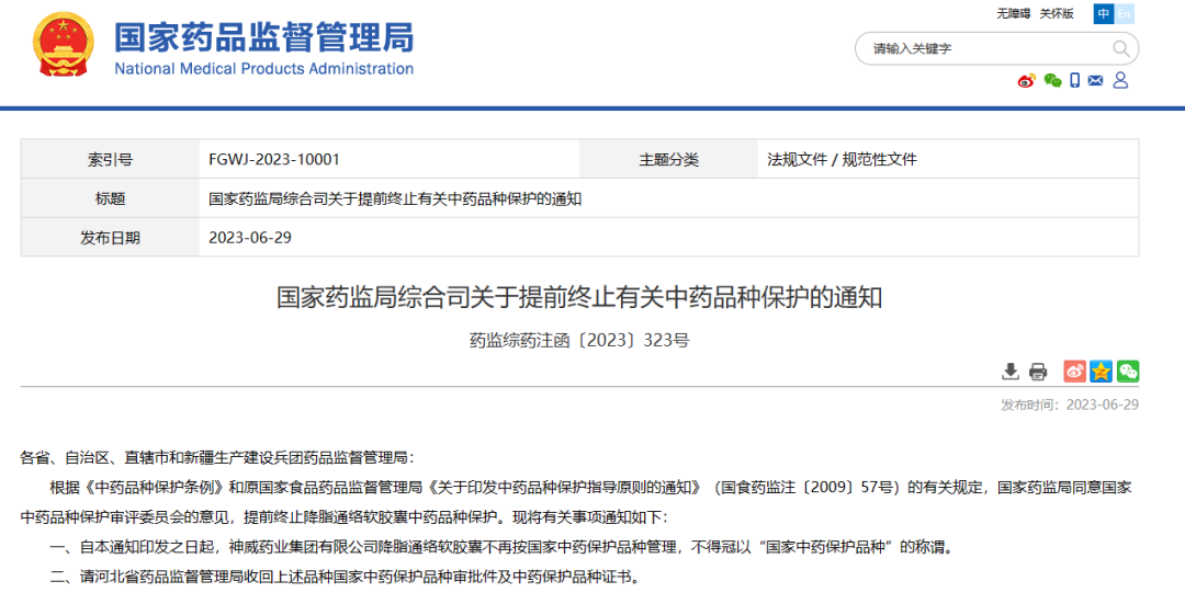 國(guó)家藥監(jiān)局綜合司關(guān)于提前終止有關(guān)中藥品種保護(hù)的通知