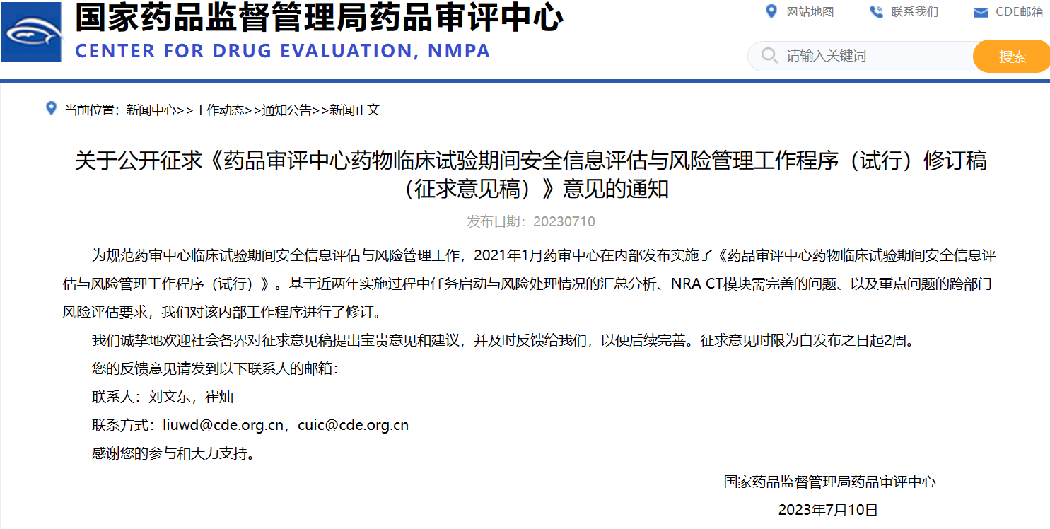 關于公開征求《藥品審評中心藥物臨床試驗期間安全信息評估與風險管理工作程序(試行)修訂稿(征求意見稿)》意見的通知