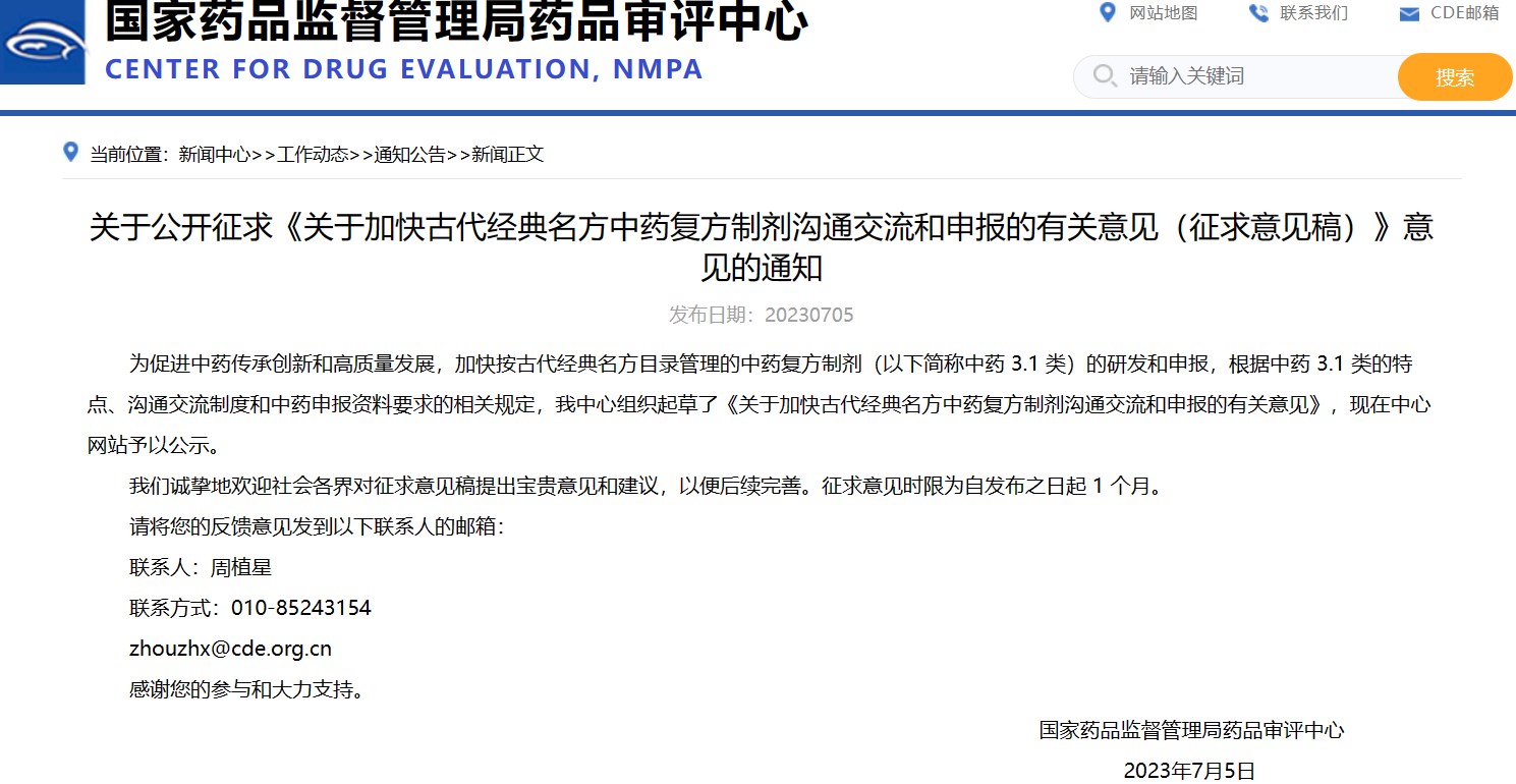 關于公開征求《關于加快古代經典名方中藥復方制劑溝通交流和申報的有關意見(征求意見稿)》意見的通知