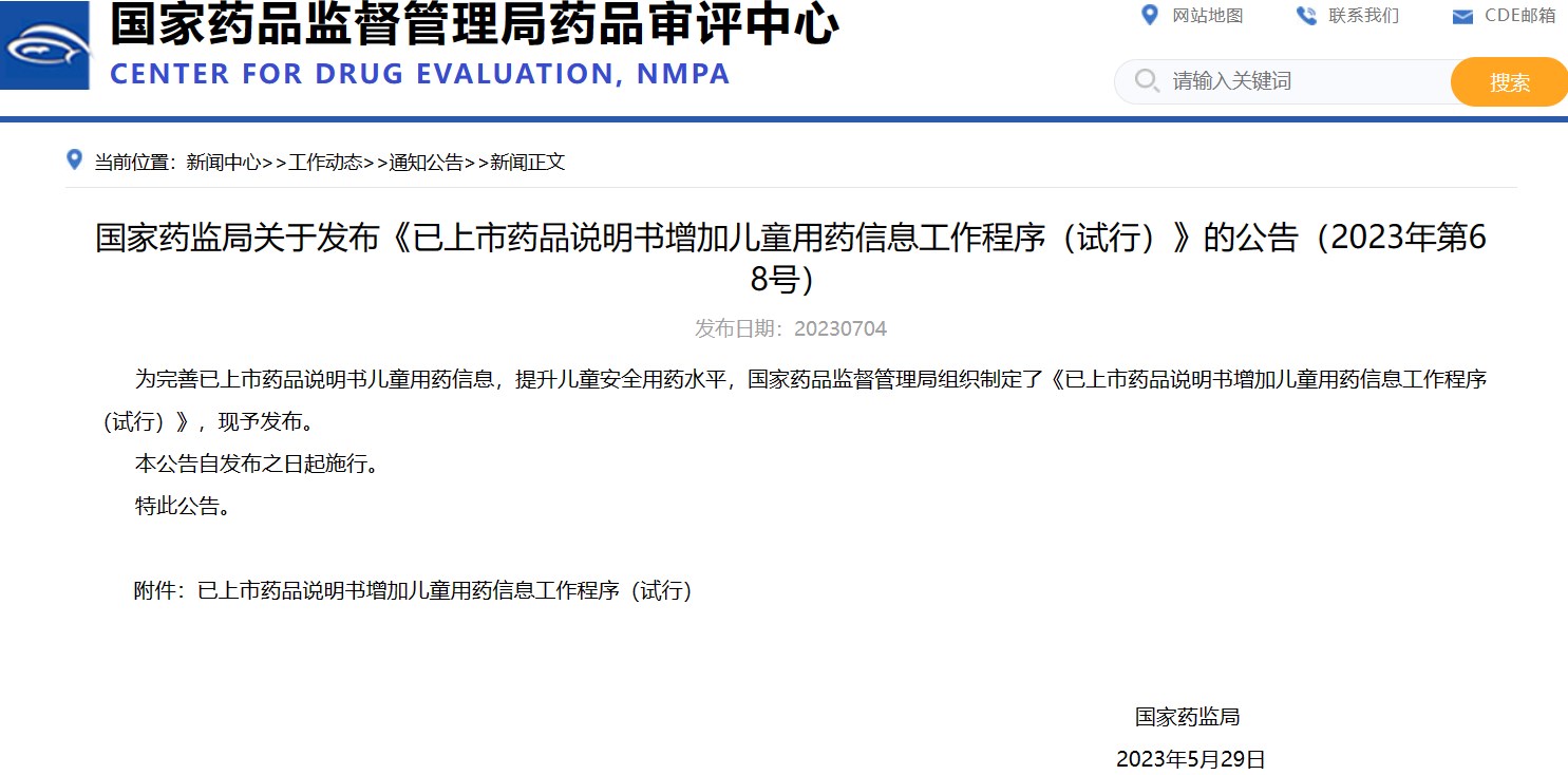 國家藥監(jiān)局關于發(fā)布《已上市藥品說明書增加兒童用藥信息工作程序(試行)》的公告(2023年第68號)
