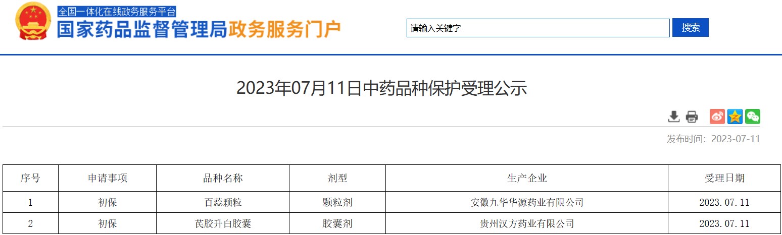 2023年07月11日中藥品種保護受理公示