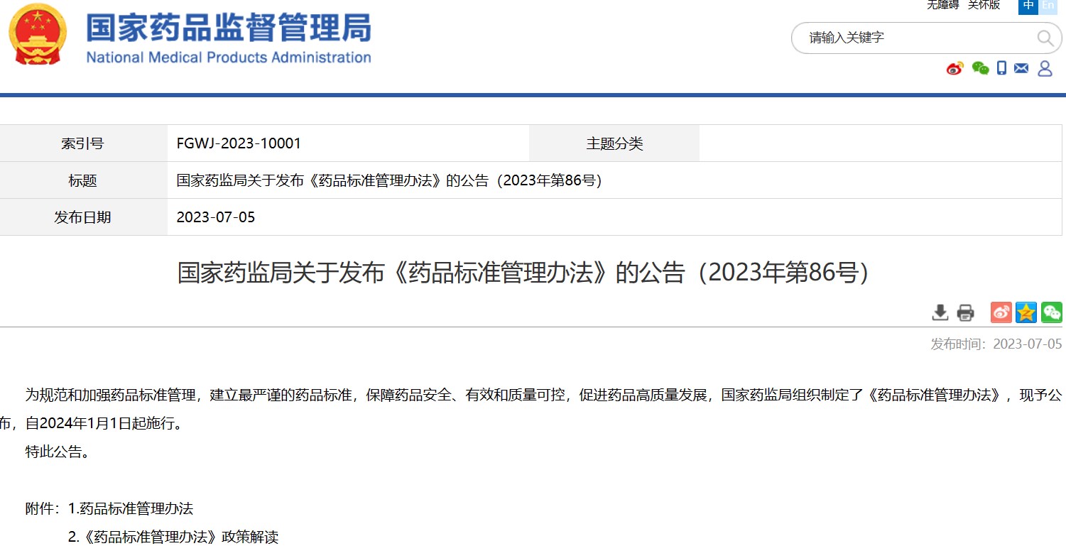 國家藥監(jiān)局關于發(fā)布《藥品標準管理辦法》的公告(2023年第86號)