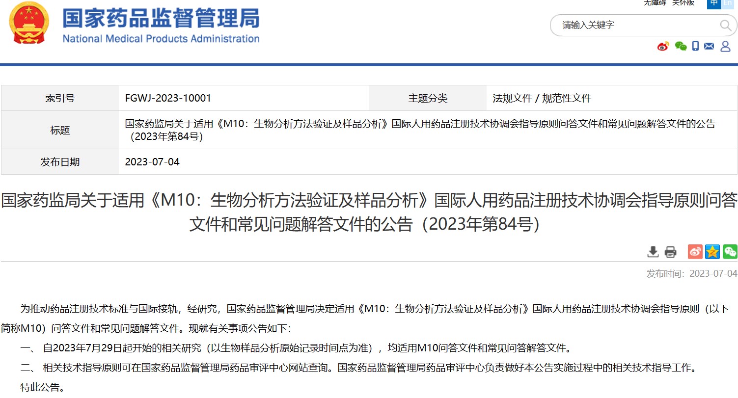 國家藥監(jiān)局關于適用《M10:生物分析方法驗證及樣品分析》國際人用藥品注冊技術協調會指導原則問答文件和常見問題解答文件的公告(2023年第84號)